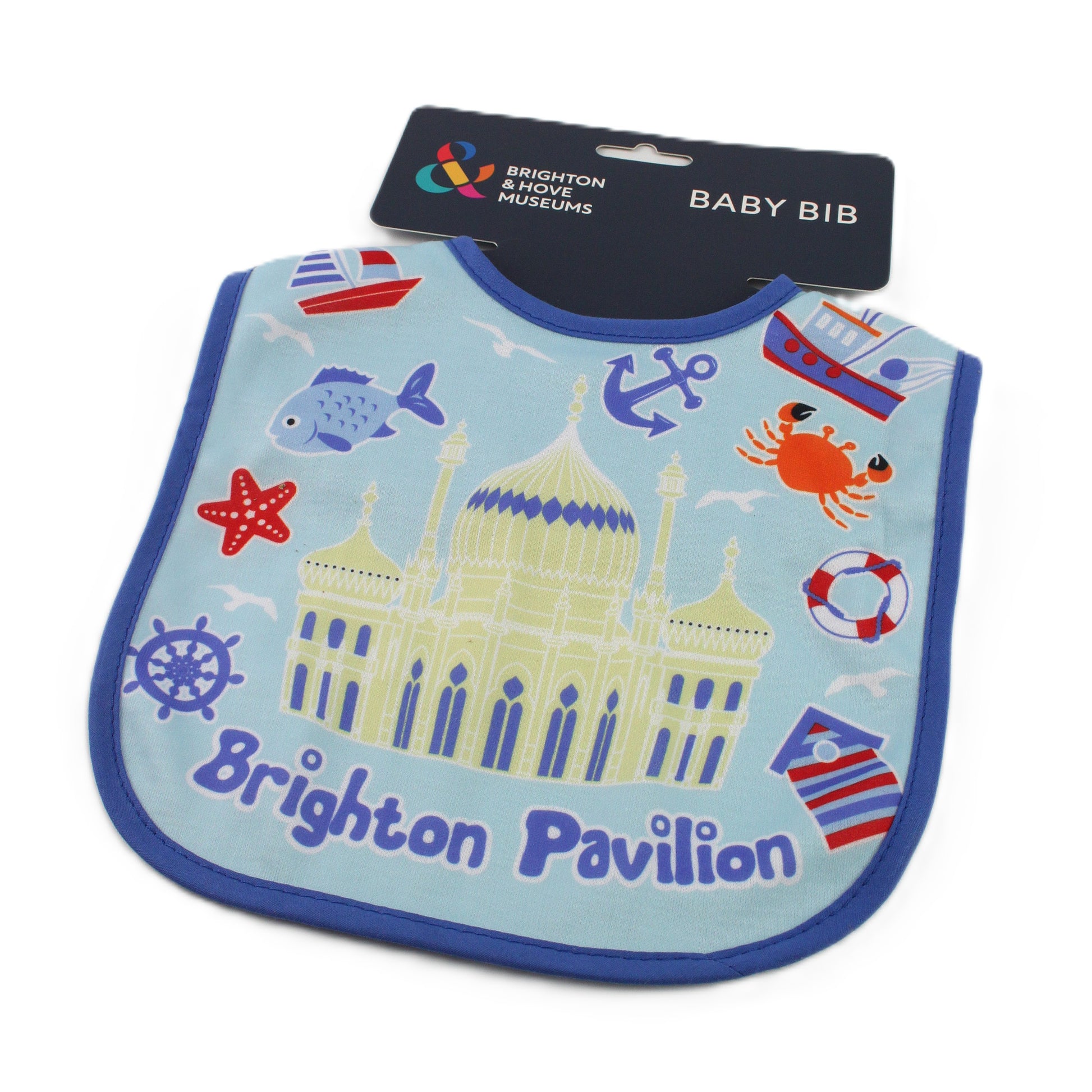 An adorable baby bib with a fun design of the Royal Pavilion with a seaside theme, including fish, boats and starfish.
