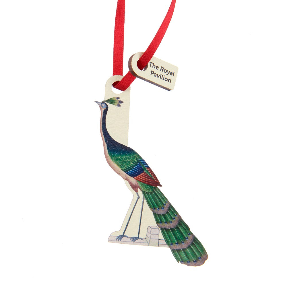A wooden hanging decoration inspired by the wallpapers at the Royal Pavilion. The pattern is repeated on the reverse side and the decoration hangs from a red ribbon.